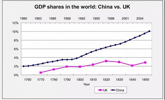 這張圖表達了我們中國經濟在世界中的比重變化。請大家注意,圖中這張圖的兩根虛線,最后并成了一根虛線。