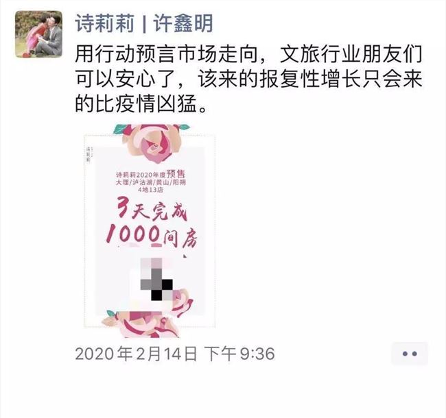 對負(fù)面消息最好的回應(yīng)便是業(yè)績。 2 月 14 日下午,許鑫明曬出了詩莉莉的階段性成果: 3 天 1000 間房。